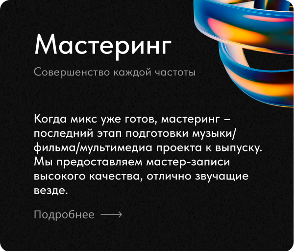 Мы — профессиональная студия аудиопроизводства, в составе которой работают опытные инженеры по сведению и мастерингу, композиторы и саунд-дизайнеры. Наша миссия — улучшать проекты с помощью звука и музыки для их более точного восприятия целевой аудиторией.